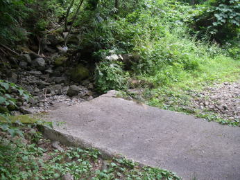 | 桑ヶ谷林道終点。涸れた沢を渡る小さな橋がある。ゲートで閉鎖されているわけではないが、この先は道幅はあるものの乗用車では走れそうもない。 この付近にも車を止められるスペースがある。この他にも手前数ヶ所に車を止められるスペースがあった。私は最初に林道がT字路なるところ、林道終点の400-500mくらい手前に車を止めた。 |