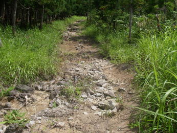 | 大きな道路が山頂付近までに出来ていて、一ぷく平付近から先は地図で見るのと様相が全く違っていた。道路の終点からは20分ほどで山頂だ。それも登山道全体に砕石が敷かれて、急なところは丸太の階段でステップにあたる所にも砕石が敷かれている。この大きな道を車で来れば20分ほどで登れてしまうので、鷲ヶ岳は登山の対象ではなくなってしまいそうだ。 |