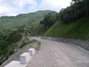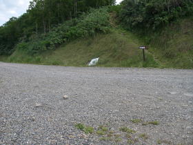 | 林道終点から30分ほど歩くと、削られた山肌とその下を走る車が見えるようになり、間もなく鷲ヶ岳スキー場への分岐に到着した。もうそろそろ一ぷく平らかなと思っていると大きな道路に出てしまった。向かいに一ぷく平に行く階段がある。 |