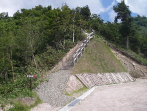 | 顕彰堂の脇に登山道があるがすぐに大きな道路に下りてしまう。 |