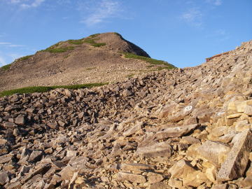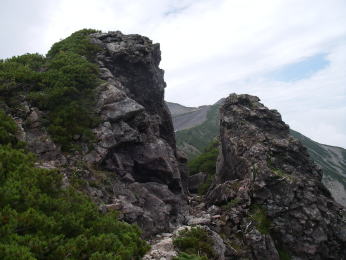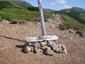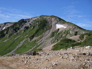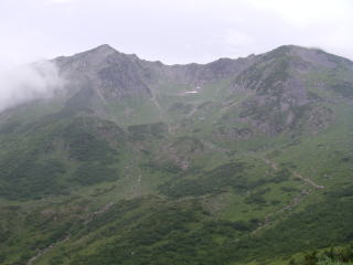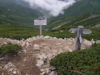 | 双六岳。どういうわけか双六岳の山頂にだけガスがかかり展望なし。 |