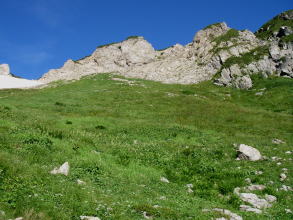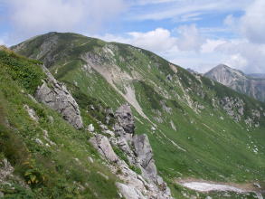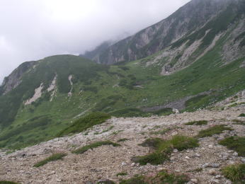 | 杓子平から見上げる笠ヶ岳に続く稜線。杓子平で休んでいる間に雨が上がり、花の写真を撮りながら稜線に向かう。 |