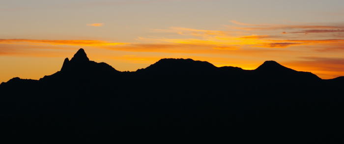 | 前日とはうって変わった好天。日の出間近のあかね雲を背景に穂高、槍のシルエットがくっきりと見えた。 |