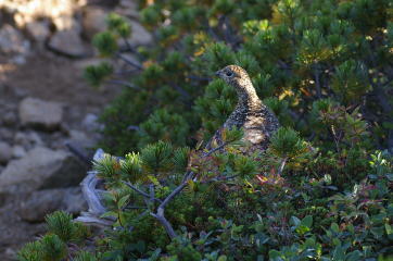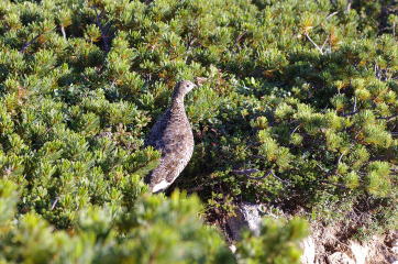 | 登山道に現れたライチョウ。私が止まれば止まり、歩けば同じ間隔が出来るように進み、また止まれば止まるということを何度か繰り返した後、ハイマツに中に消えた。 |