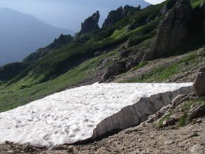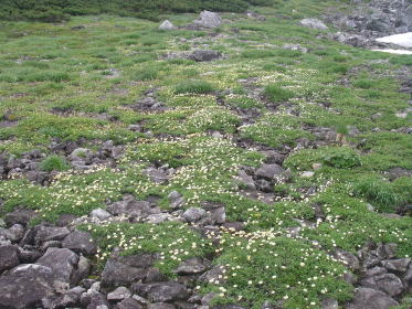 | 三俣山荘付近でトラバースする雪渓の近くにはチングルマの花がたくさん咲いていた。他では穂のようになっていて花が見られたのはここだけ。 |