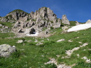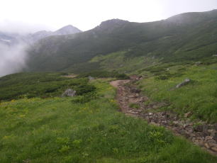 | 三俣山荘から双六小屋に至る巻き道の景観。この巻き道にも花がたくさんあった。 |