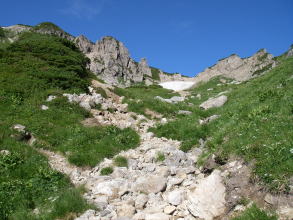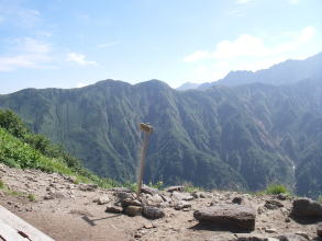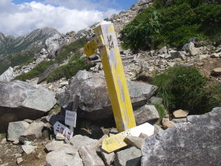 | 黒部乗越。ここから三俣蓮華岳の巻き道に入り三俣山荘に向かう。 |