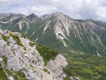 | 笠ヶ岳を背景に中央の双六岳、右の三俣蓮華岳。下には三俣山荘が見える。 |