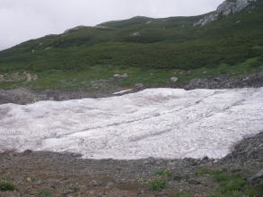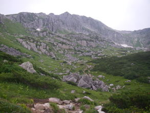 | 山頂にはガスがかかり、カールをのぞき込んでも何も見えなかった。 |