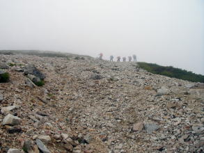 | 鷲羽岳の登りにかかるとガスが出て、先を行くパーティーが霞んで見える。 |