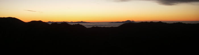 | 水晶小屋の前から見る日の出前の雲海の広がる光景。周囲の山がくっきりと見え、槍ヶ岳の隣には富士山も見えた。黒部湖も見え、立山、剣岳も間近に見える。小屋の人も出てきて写真を撮っていた。 |