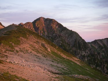 | 朝日を浴びて赤く染まる水晶岳。 天気が悪ければワリモ岳、鷲羽岳を巻いて三俣山荘に出るつもりだったが、素晴らしい展望が約束されているような天気なのでワリモ岳、鷲羽岳と辿ることにして出発。 |