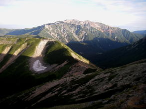 | 太陽の高さの変化による色合いと陰影の変化と、歩くことによる場所の変化で刻々変わる山の景観を楽しみながら歩いた。 |