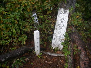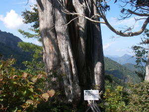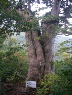 | 三吉ミチギには細い流れの水場があり、この近くまでは沢沿いの道で、この時期でも花がたくさんあった。叶の高手に近づく頃から朝日岳が見えるようになる。叶の高手付近にはクロベの大木が2本あり、それぞれ朝日岳の大クロベと書いた案内があった。 |