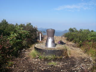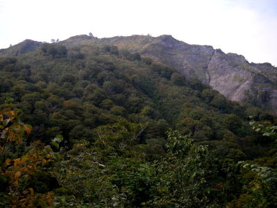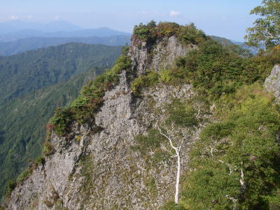 | 稜線から見る朝日岳 山頂からは、周囲に灌木が生えているのでこんなに切り立ったところにいるようには感じられない。 この反対側も叶の高手の方から見ると急な岩壁になっているがやはり山頂からは切り立ったところにいるようには感じられない。 |