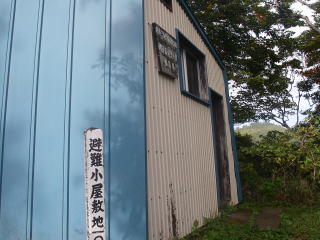 | 熊の平の朝日岳避難小屋。中を覗いてみると、ザックがひとつあった。宿泊した人がザックを置いて山頂に向かっているようだ。近くに水場はなさそうだが、20人くらいは泊まれそうな大きさだ。 |