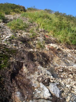 | 山頂付近の稜線出る所では、崩落跡のような急斜面を登る。 |