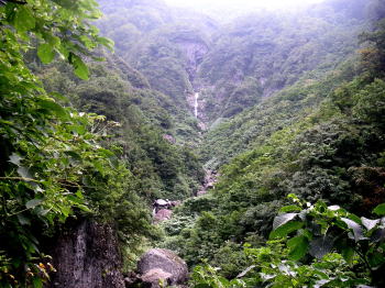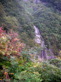 | 四合目の清滝から見る大滝 清滝から先は鎖場が多くなり、それも鎖に頼らなければ登れないような急斜面の岩場が多くなる。 |