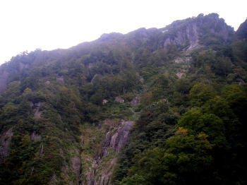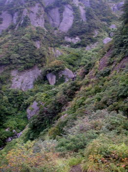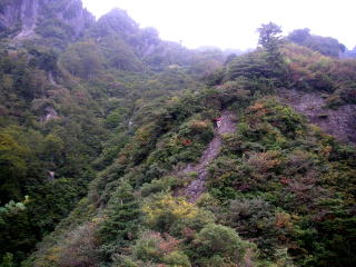 | 更に進むと、岩壁が迫り、こんな急斜面のどこに登山道が付いているのだろうかと心配になるくらいだ。 |