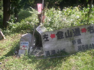 | 屏風道の二合目登山口は新開道の二合目登山口にもなっていて、ここからは最短距離で八海山の八ツ峰を歩いて戻ってくることができる。10台ほど止まれる駐車場もある。登山口にある屏風と書かれた石碑(右)は古い登山道であることを伺わせる。 |