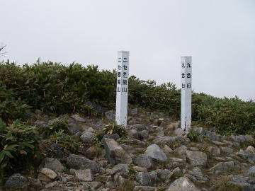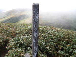 | 朝日岳への縦走路の分岐のを示す道標。道標があるのだから道はあるのだろう。 |