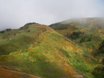 | ニセ巻機山付近から見る巻機山への登山道には長い人の列が見えた。 |