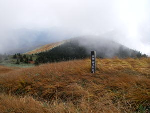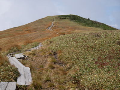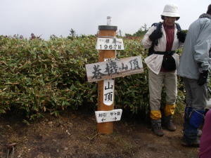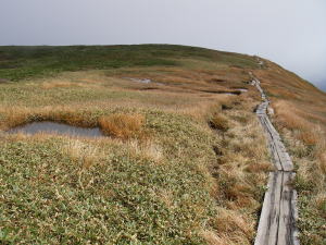 | 木道は2.5万図の巻機山の山頂は通らず、何の標識もない。木道にはロープが張ってあり山頂には行けない。 |