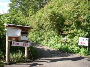 | 登山口。駐車場はいっぱいで、ちょっと戻って草地の駐車スペースへ。 |