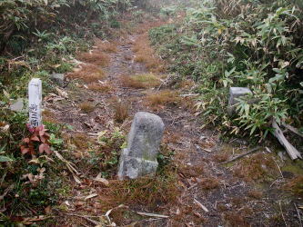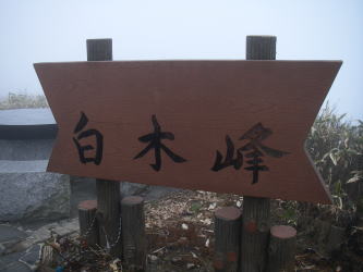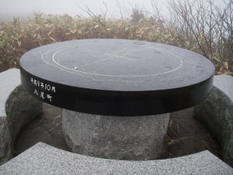 | 山頂の山名表示と大きな石でできた展望方位盤。とても大きく、側に座るところが設けられテーブルとしても使えるようになっている。ガスがかかり、展望はなし。分岐に戻り、小白木峰へ。 |
