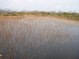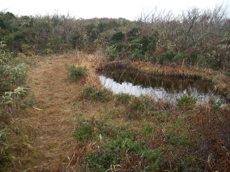 | 小白木峰の先にある2つの池塘。右の池塘が金剛堂山を映してみることができると紹介されているものらしいが、展望がなく見ることはできなかった。この時点では小白木峰を確認できなかったので、確認のため更に進むと急速に高度を下げる道になり付近には峰はないことを確認できたので戻った。 |