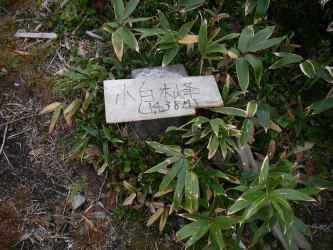 | 帰路、山頂の藪の中に小白木峰と書いた板があるのを見つけ、三角点の上に置いて撮る。 |