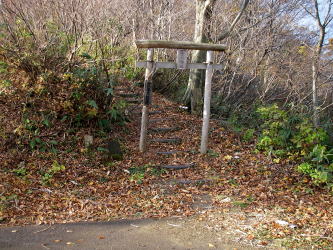 | 夕霧峠では登山道は一旦林道に下りる。夕霧峠を越える林道と別の夕霧峠に達する林道があり、T字路になっている。駐車場はないが、駐車できそうなスペースはある。休憩所やトイレもあった。奥医王山へは峠にあるこの鳥居をくぐって行く。 |