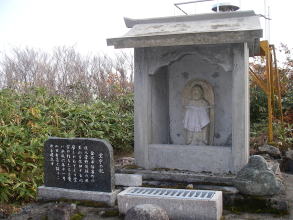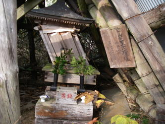 | 山頂の社。覆いが倒れて押しつぶされている形に。小さなものなので簡単になおせそうなのだが、雪が降ることを考えると簡単ではないのかも。 |
