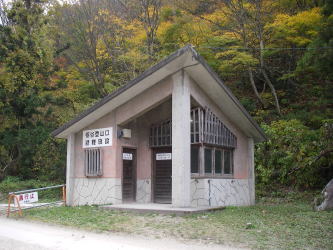 | 栃谷登山口。広い駐車スペースとトイレがあり、パイプで引いた水が流し放しになっている水場もある。 |
