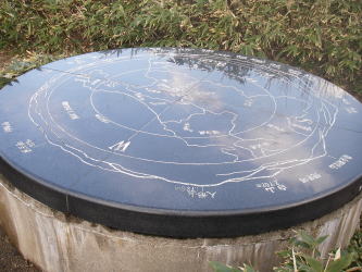 | 直径が2m以上ある前金剛の大きな方位盤。 方位盤には奥金剛も書かれているが、2.5万図では前金剛、中金剛、奥金剛は一直線上に並んでいるので見えている中金剛の後に隠れているものと思って奥金剛に向かった。 |