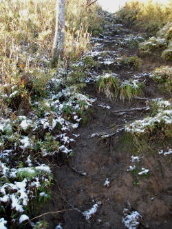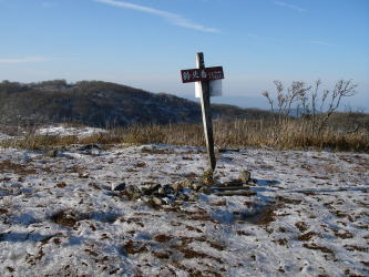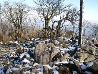 | 鈴北岳に近づくと、雪が少し積もっていた。前日、登山口では一時ミゾレ交じりの雨が降ったが、高いところでは雪だったのだ。 |