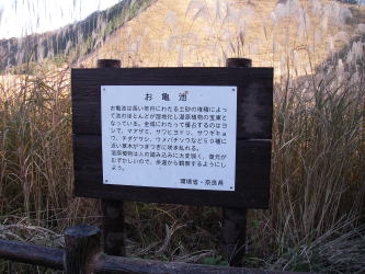 | 登山口は曽爾高原入口にあり、すぐ前に有料駐車場がある。入口にはガイドマップがあって、2.5万図には書いていないことが分かり助かる。入口にはお亀池があるが、実際はススキの原で池のようには見えない。まずお亀池の縁のハイキングコースを歩き、亀山峠を目指す。 |