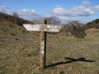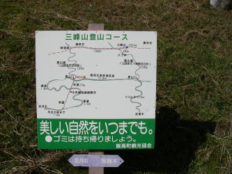 | 登山口にある登山コースの案内。これで林道を更に進めば八丁平に直接登る登山口にも行かれることが分かる。2.5万図にはない林道だ。 |