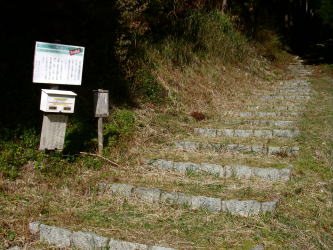 | 月出登山口。駐車スペースもある。登山口付近は角棒状に切り出した石で階段を作ってある。 |