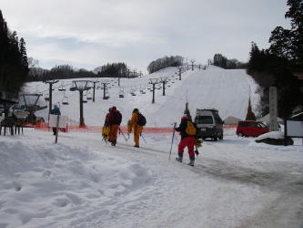 | みねかたスキー場の入口近くの駐車場からリフトの下の雪が踏み固められたところは靴で歩き、柔らかい雪があるところまで行ってスノーシューを履く |