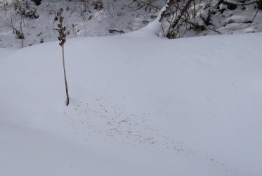 | 雪の上に散った種を見たり、小さな足跡を見つけて興味津々 |