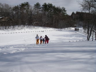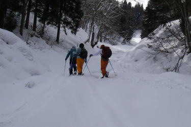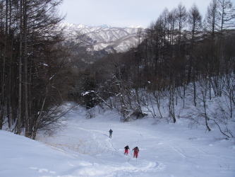 | 頸城の山々を背に歩くスキーコースに出る斜面を登る |