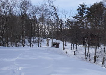| 寒さを全く感じないほどの陽気の下、後立山連峰の山々の展望を楽しみながらお茶を沸かしてティータイムをゆったりと楽しんだ。 帰路は、登るときに通った道ではない急な斜面をちょっとだけ下ってから宮の入コースに入りスキー場の入口に戻った。 |