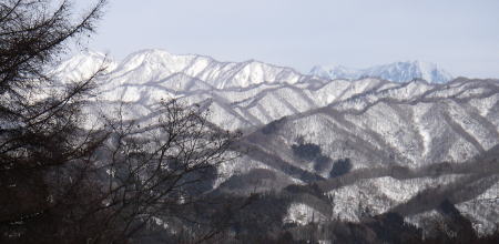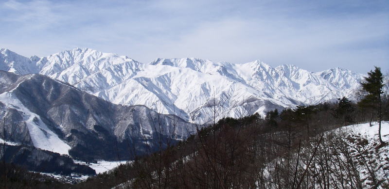 | スノーシューハイクの初体験。5年ほど前にかんじき代わりにしようと思って買った二つ折りにできる小型のスノーシューが初めて役立ちました。 好天に恵まれ、白馬夢牧場からは後立山連峰と頸城山塊の白く輝く峰々を見ることができました。 |