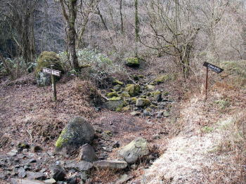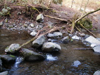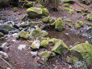| 分岐のすぐそばで沢を渡る。朽ち果てた橋の痕跡のようなものが残っているので、昔は整備の行き届いたコースだったのだろう。 |