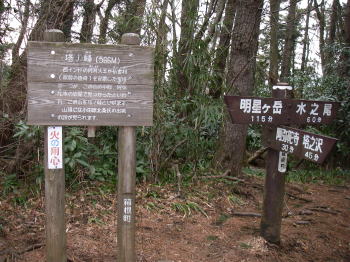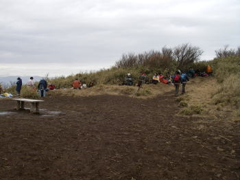 | 明神ヶ岳。冷たい風を避けるために藪を背に大きなパーティーが休んでいた。山頂付近ではほんのちょっとだけミゾレが降った。 |