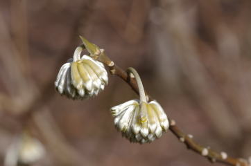 | 風の冷たさを感じながら歩き出したが、だんだんと風も収まり、日差しの暖かさを感じられるようになってきた。コース全体にわたって雪はなく、暖冬のせいかミツマタのつぼみがもうだいぶふくらんでいた。 |