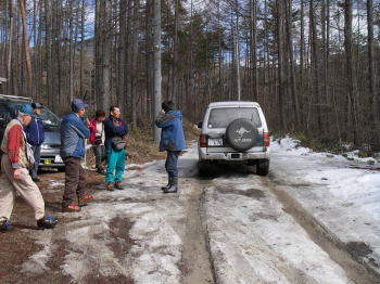| 唐沢鉱泉・桜平の分岐で小屋の車に乗り換え桜平へ。16名の一行なので雪上車で2回に分けで運ぶ必要があり、まず雪上車の定員いっぱいの人が荷物をなるべく持たないで2台の4WDで先行し、残りの人と荷物は次の便ということになった。 |