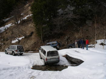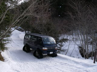 | 桜平からちょっと下った沢の脇が雪上車への乗り換え場所。荷物を雪上車に積み替えるためハイエースはバックで沢に入り、対岸から荷物を下ろせるようにした。スタッドレスタイヤでこんな坂も登れるんだと感心する。 |