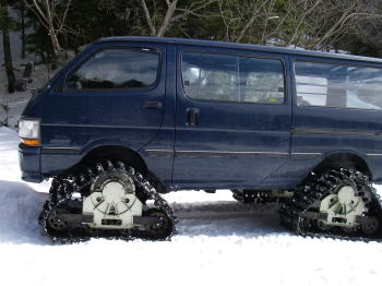| 唐沢鉱泉・桜平の分岐から、小屋の4WDと雪上車で夏沢鉱泉まで連れてっていただけるというお手軽コースで硫黄岳に行ってきた。雪上車に乗るのは初めてなので興味津々。適度な新雪があれば雪上車らしい乗り心地を楽しめたのかも知れないが、随分ながく雪が降っていないので路面はでこぼこ、激しい揺れを楽しんできた。 |